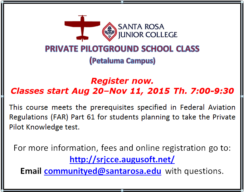 Private Pilot Ground School Class – Santa Rosa Junior College – August 20 – November 11Contact Barbara O’Grady at barbaraog@juno.com with any questions.